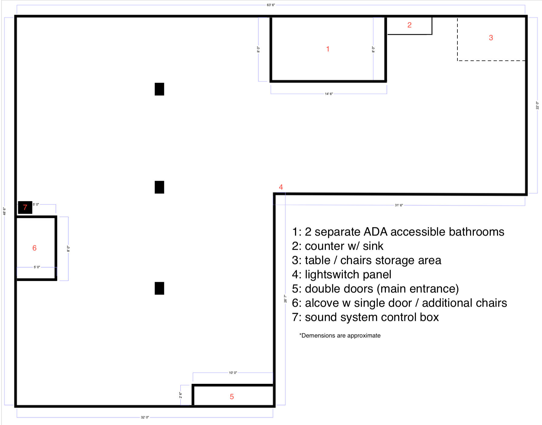 Accessibility:Our space's main entrance is wheelchair accessible, and both bathrooms are wheelchair accessible.