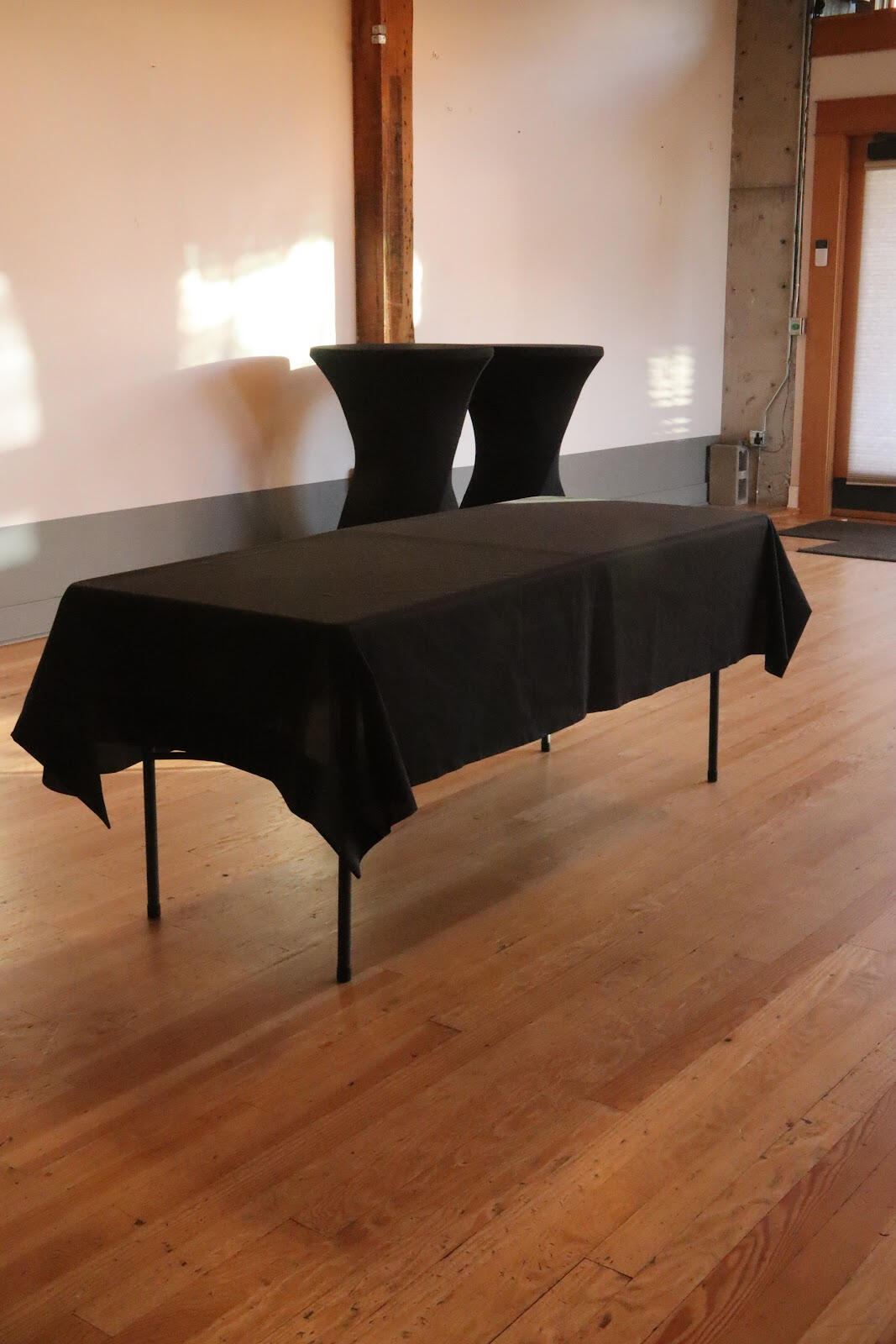 - 3 Rectangular tables w black linens (6' x 29") (seats 8 each)