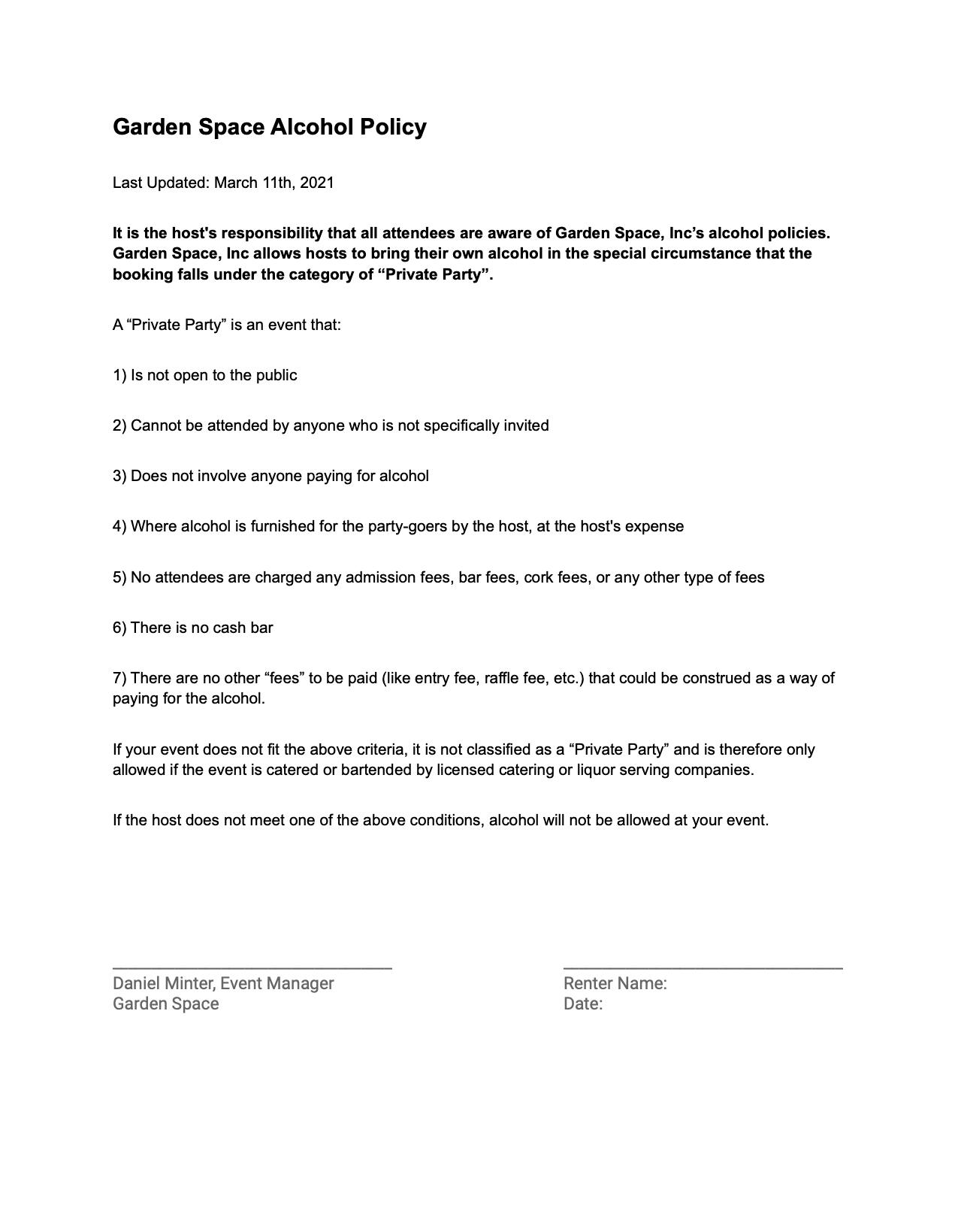 Alcohol Policy:You are free to bring your own alcohol into the space AS LONG as you abide by our Alcohol Policy. If your event does not comply with our alcohol policy, you must either 1) not serve alcohol, or 2) have alcohol served by a OLCC licensed bartender.